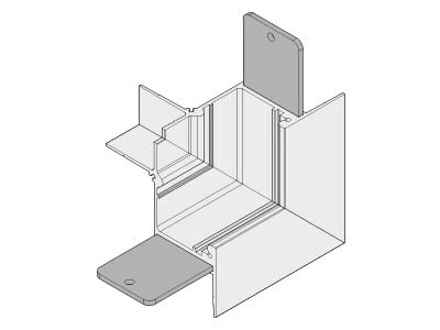 Elemento di collegamento per due linee di profili componibili con angolo 3 di giunzione verticale interno di 90° per installazione incassta a scomparsa parete-parete / soffitto-soffitto misure esterne 64x64mm. Bianco opaco.