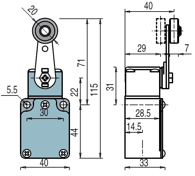 Interruttore di posizione a leva girevole diritta con rotella, Custodia metallica, una entrata cavi filettata, IP67 secondo IEC 60529 con pressacavo avente grado di protezione uguale o superiore, 1NO-1NC scatto rapido.