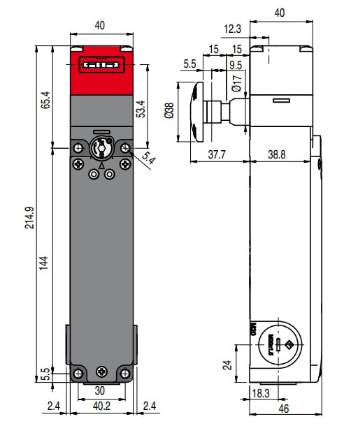 Interruttore di sicurezza con elettromagnete ad azionatore separato. Grado di protezione: IP67 secondo EN 60529 con pressacavo avente grado di protezione uguale o superiore. Modalità lavoro: Principio D, azionatore bloccato ad elettromagnete diseccitato.Custodia: Custodia in metallo, tre entrate cavi filettate M 20x1,5. Unità di contatto: 1NO+1NC mossi dall'azionatore e 1NO+1NC mossi dall'elettromagnete. Testa: Testa orientabile con pulsante antipanico. Lunghezza pulsante di sblocco: per spessore paretemax 15 mm. Alimentazione: 24 Vac/dc. LED: Senza LED. Azionatore: Completo di azionatore piegato VF KEYF21. Apertura positiva: Sì