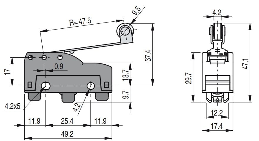 Microinterruttore a leva con rotella. Temperatura ambiente: Da -25°C a +85°C. Custodia: Custodia in tecnopolimero rinforzato con fibra di vetro, autoestinguente ed antiurto. Tipo di terminale: A vite con piastrina autosollevante. Unità di contatto: 1NO+1NC, scatto rapido in deviazione. Grado di protezione massimo: IP40 con copriterminali. Tipo di azionamento: Azione diretta. Azionatore: A leva con rotella (l=48 mm)