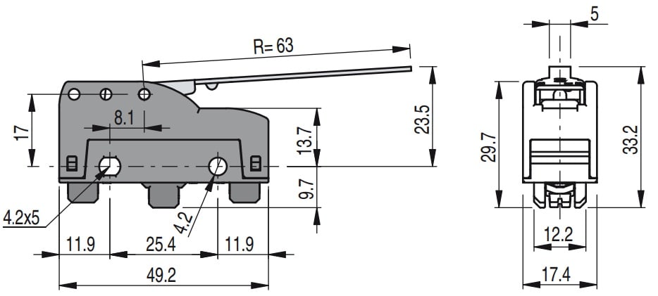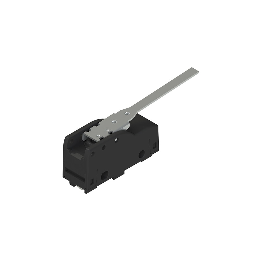 Microinterruttore a leva. Temperatura ambiente: Da -25°C a +85°C. Custodia: Custodia in tecnopolimero rinforzato con fibra di vetro, autoestinguente ed antiurto. Tipo di terminale: A vite con piastrina autosollevante. Unità di contatto: 1NO+1NC, scatto rapido in deviazione. Grado di protezione massimo: IP40 con copriterminali. Tipo di azionamento: Azione inversa. Azionatore: A leva (l=63 mm)
