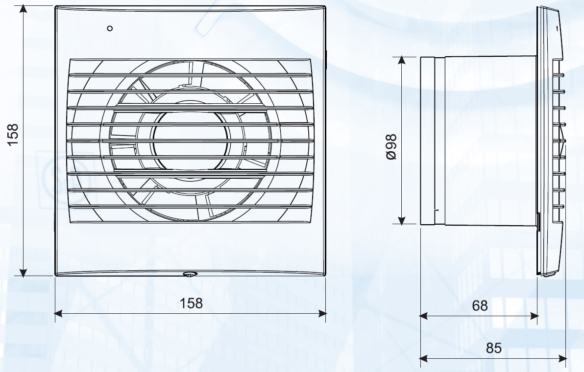 Ventilatori elicoidali extrapiatti, silenziosi ed eleganti per installazione a parete o a soffitto in bagni e toilette. Sono costruiti in materiale plastico di alta qualità, con serranda antiritorno incorporata e spia luminosa di funzionamento. Motore monofase con protezione termica, classe II (doppio isolamento), IP44, temperatura massima di funzionamento 40°C. La gamma si compone di tre versioni con portate d’aria nominali di 100, 200 e 300 m3/h rispettivamente con diametro foro 100, 120 e 150 mm. Ventilatori elicoidali extrapiatti, con serrandaanti-ritorno incorporata; portata di circa 100 m3/h, spia luminosa di funzionamento e motore 230V 50Hz, Classe II, IP44, con protezione termica per temperatura di esercizio fino a 40°C. Con Spia luminosa e Serranda antiritorno