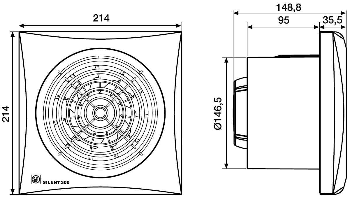 Ventilatori elicoidali con basso livello sonoro con portata di circa 280 m3/h. Con serranda anti-ritorno incorporata, spia luminosa di funzionamento, motore 230V-50Hz con cuscinetti lubrificati a vita e montati nel silent-blocks, IP45, Classe II, con protezione termica per temperatura di esercizio fino a 40°C.