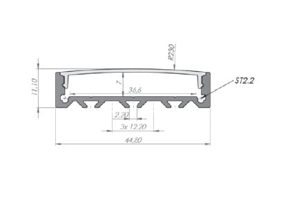 Caratteristiche: Larghezza 44,80 mm per potervi alloggiare fino a 3 strip LED. Copertura rimovibile con un click. Utilizzabile come corpo illuminante indipendente. Utilizzabile con Strip LED di bassa/alta potenza. Applicazioni: Illuminazione principale del banco “reception” negli hotel. Illuminazione di vetrine.
