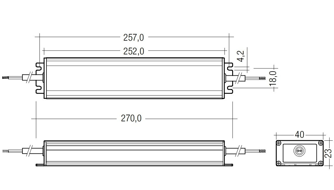 Descrizione del prodotto: LED Driver a tensione costante. Tensione di alimentazione universale. Tensione in uscita costante. Collegamento: cavo con puntalini (lunghezza circa 500 mm). Identificatori di polarità sul secondario: + rosso / - nero. Coperturametallico, resinato. Durata vita nominale di max. 50.000 h (con ta 50 °C con un tasso di mal funzionamento ≤ 0,2 % per 1.000 h). 5 anni di garanzia. Idoneo per unità illuminazione d'emergenza conf. EN 50172. Conforme alla CLASSE C in una gamma compresa tra il minimo ed il massimo carico in accordo alla EN 61000-3-2. Proprietà: Costruzione compatta. Elevata efficienza. Basse perdite di potenza. Protezione da sovratemperatura con riaccensione automatica. Protezione da sovraccarichi. Protezione contro il cortocircuito con riaccensione automatica. SELV. Tipo di protezione IP67. Copertura di metallo .