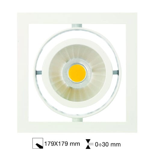 Installazione: Incasso a Soffitto, foro incasso: Foro di incasso 179 x 179 mm. Spessore controsoffitto: 1-30 mm, fissaggio: Con staffe regolabili in dotazione, corpo / struttura: Corpo in lamiera in acciaio e cornice/anello in pressofusione di alluminio,verniciatura: Verniciatura per interni in polveri epossidiche, colore: Bianco, riflettore ottica: Riflettore in alluminio purissimo 99,8% - Ottica orientabile alimentatore: Alimentatore remoto per diodi LED, uscita stabilizzata 1200mA dc, tensione: 220-240V 50/60Hz, fascio luminoso: Simmetrico diffondente 30 °, classe isolamento: Classe 2, peso: 2,150 kg.