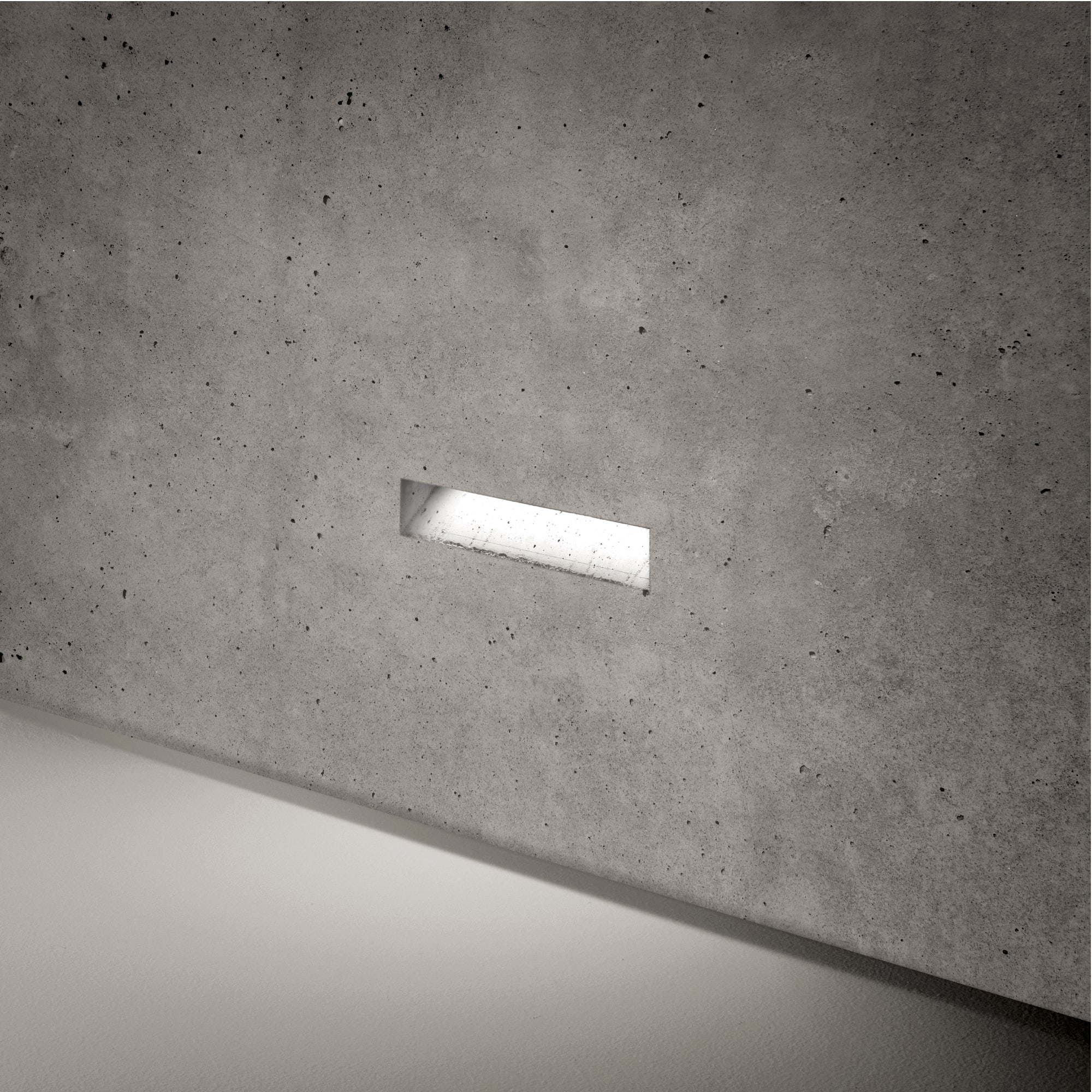 Ghost Lineare L 240mm per cemento - Apparecchio da installazione a parete. Grado di protezione IP 65. Ghost è un incavo luminoso che si ottiene tramite l’utilizzo di un’apposita cassaforma da ancorare al cassero prima del getto in calcestruzzo. L’articolo si compone di due elementi: la cassaforma e il corpo illuminante. La cassaforma in allumino è costituita a sua volta da due parti complementari: - una dima , che da forma all'incavo, e viene estratta insieme al cassero dopo aver completato il getto e aver rimosso le viti; - un involucro che rimane annegato all'interno del getto e che successivamente ospiterà il corpo illuminante. (La cassaforma viene fornita completa di tiranti, sistema di bloccaggio e adesivo da apporre sul cassero per definire il corretto posizionamento dell'incavo finale). Il corpo illuminante in alluminio pressofuso si ancora, tramite apposite viti, all'interno dell'involucro e rimane completamente nascosto nell'incavo. Resistenza meccanica IK 06. Diffusore in vetro temprato e puntinato. Sorgente luminosa, con posizione lampada fissa. 2 cassaforme in polipropilene con sistema di bloccaggio al cassero + Corpo illuminante con MID POWER LED bianco 4W 412lm 4000K CRI80 - 230V. Finitura: Cemento.