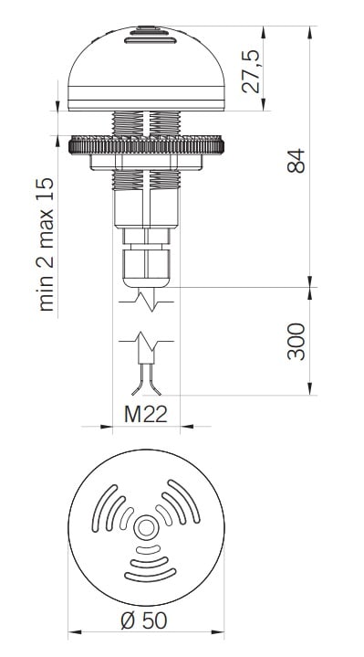 Buzzer piezoelettrico multifunzione, sviluppato con tecnologia multicanale. P50 A consente sette modalità di allarme selezionabili tramite contatti elettrici indipendenti. Versione con pressacavo M12. Policarbonato autoestinguente ad alta resistenza agli impatti, guarnizione o-ring in EPDM presente sulla cupola e guarnizione in poliuretano sulla base. Può essere installato a pannello tramite foro Ø22 e bloccato con l’anello di chiusura fornito. Connessione elettrica tramite pressacavo M12. Circuito acustico con buzzer multitensione. Sette suoni disponibili (Suono Continuo - Suono Intermittente Lento, Suono Intermittente Veloce, Suono Intermittente doppio, Suono Intermittente Triplo, Telegrafo, Random). Frequenza: 3500+/-100Hz