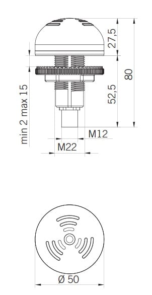 Buzzer piezoelettrico con luce LED multifunzione, sviluppato con tecnologia multicanale. P50 A LED consente diverse modalità acustico/luminose selezionabili tramite contatti elettrici indipendenti: Luce fissa, Suono continuo, Luce fissa + Suono continuo,2 Flash - suono/luce sync, 3 Flash - suono/luce sync, Intermittente - suono/luce sync, Random - suono/luce no sync. Versione con connettore a montaggio rapido QC M12. Policarbonato autoestinguente ad alta resistenza agli impatti, guarnizione o-ring in EPDM presente sulla cupola e guarnizione in poliuretano sulla base. Può essere installato a pannello tramite foro Ø22 e bloccato con l’anello di chiusura fornito. Connessione elettrica tramite connettore a montaggio rapido (QC M12 4 PIN). 6 LED ad alta luminosità. Cupola in policarbonato trasparente. Circuito acustico con buzzer multitensione. Cinque suoni disponibili. Frequenza: 3500+/-100Hz.