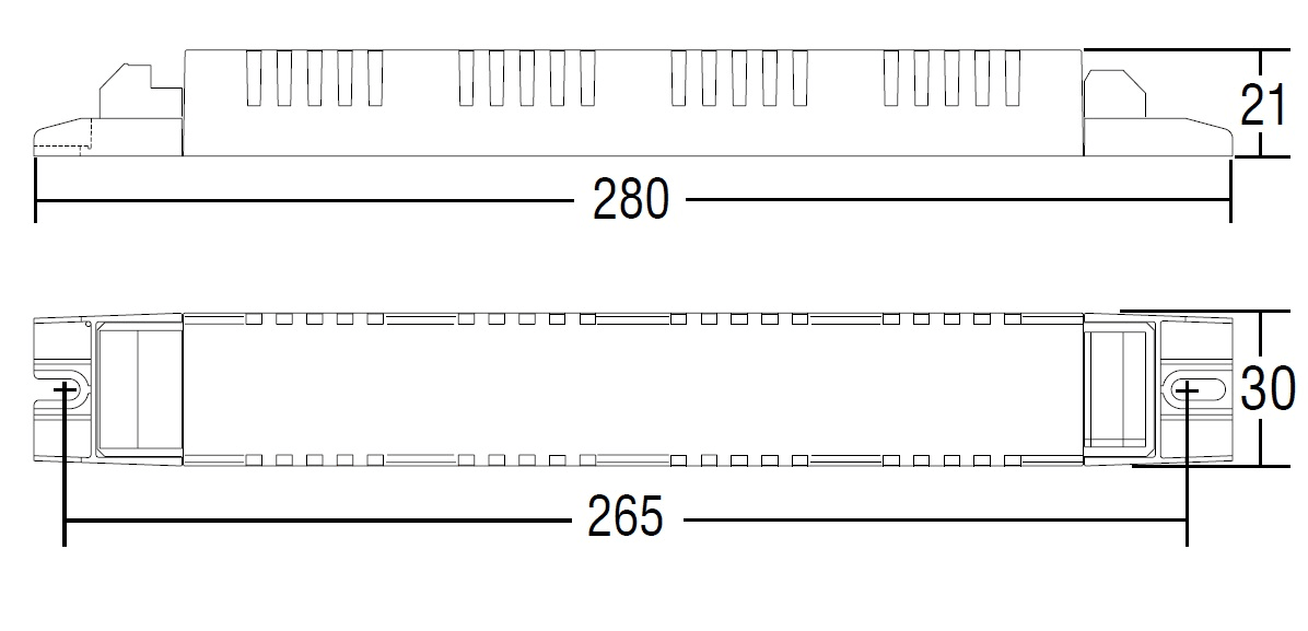Alimentatore da incorporare. Alimentatore multipotenza fornito di dip-switch per la selezione della corrente in uscita. PFC attivo. Corrente regolata ±5 % incluse variazioni di temperatura. Uscita non isolata dall’ingresso. Utilizzabile per apparecchi di illuminazione in classe di protezione I e II. Morsetti di entrata e uscita contrapposti (sezione cavo fino a 1,5 mm2 / AWG15). Fissaggio dell’alimentatore tramite asole per viti. Protezioni: termica e cortocircuito; contro le extra-tensioni di rete; contro i sovraccarichi. Protezione termica = C.5.a.