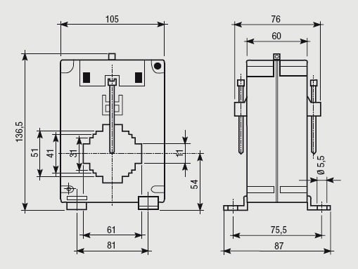 Trasformatore amperometrico a barra passante per strumenti in corrente alternata, fissaggio su guida DIN o a pannello (tramite supporti in dotazione). Doppio morsetto per secondario.