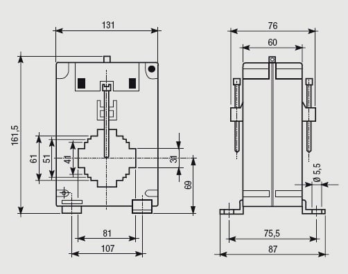 Trasformatore amperometrico a barra passante per strumenti in corrente alternata, fissaggio su guida DIN o a pannello (tramite supporti in dotazione). Doppio morsetto per secondario.