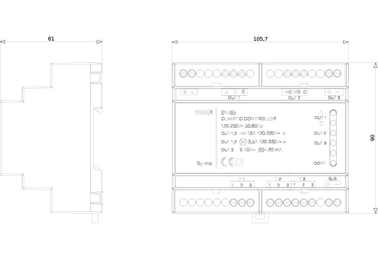 Regolatore climatico per impianti termici, dispositivo di controllo della temperatura di classe II (contributo 2%), alimentazione 120-230 V~ 50/60 Hz, 3 ingressi per sonde PT100, PT1000 e NTC, 1 uscita comando valvola miscelatrice, 1 uscita 0-10 V o (0)4-20 mA, 1 uscita a relè in scambio 8 A 230 V~, installazione su guida DIN (60715 TH35), occupa 6 moduli da 17,5 mm.