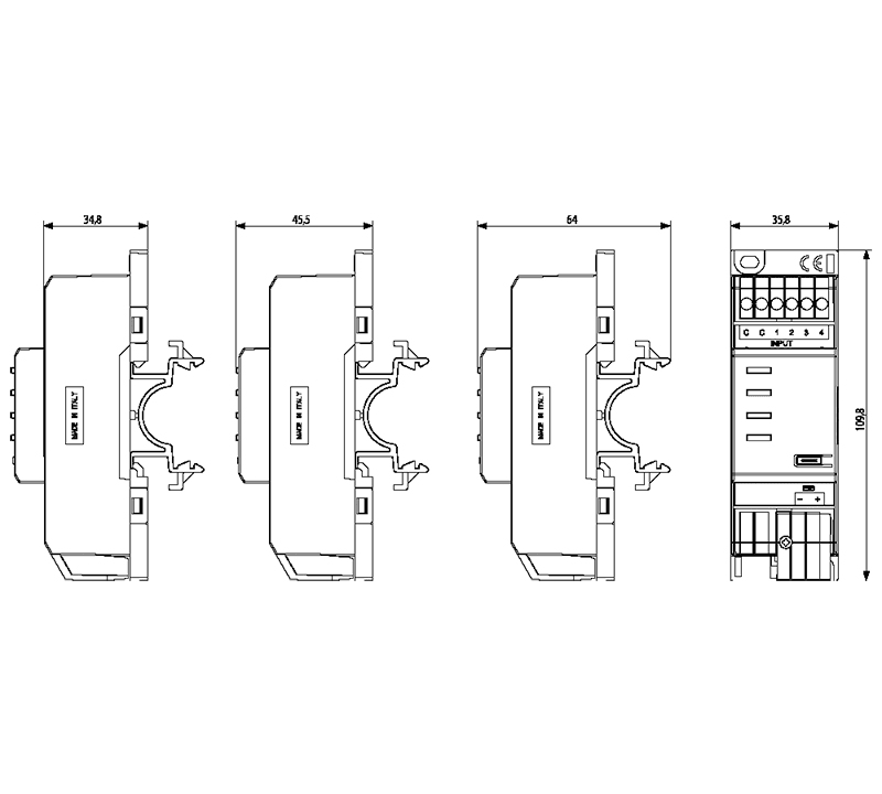 Dispositivo a 4 ingressi digitali programmabili per contatti NO, NC, 120-230 V~, standard KNX, installazione su guida DIN (60715 TH35), occupa 2 moduli da 17,5 mm