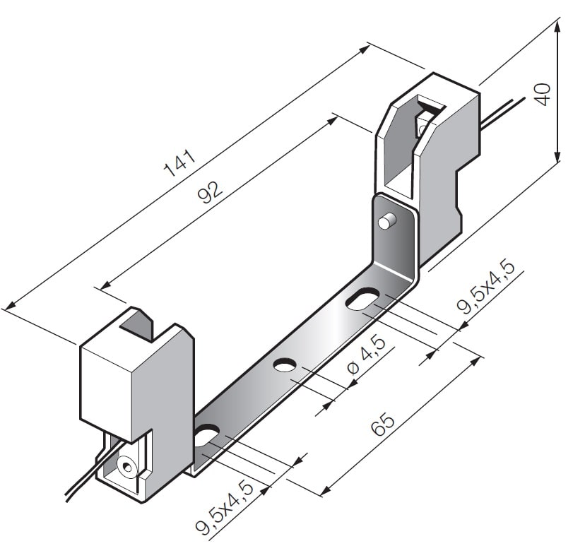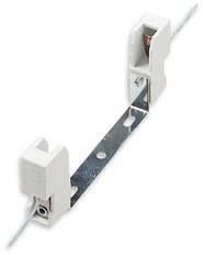 Portalampade a blocchetto steatite 8 A 250 V attacco R7s per lampade alogene 300-500 W, 200 mm cavo teflon PTFE 0,75 mm2 - staffa di fissaggio a U. Massima temperatura d’impiego continuo del portalampade 350 °C, del cavo 250 °C. Staffa con foro centrale ø 4,5 mm e asole 4,5x9,5 mm interasse 65 mm