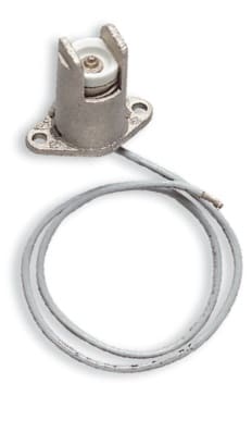 Portalampade metallico con base di fissaggio e pastiglia steatite 10 A 250 V attacco R7s per lampade alogene fino a 1500 W, 350 mm cavo teflon PTFE 1,5 mm2. Massima temperatura d’impiego continuo del portalampade 300 °C, del cavo 250 °C.Fori di fissaggio ø 3,3 mm interasse 28 mm