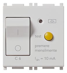 Interruttore automatico magnetotermico differenziale 1P+N C 6, alimentazione 120-230 V~ 50-60 Hz IΔn 10 mA, p.i. 1500 A - 2 moduli. Argento.