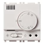 Termostato elettronico per controllo temperatura ambiente (riscaldamento e condizionamento), commutatore estate/off/inverno, ingresso per l’attivazione a distanza della funzione “risparmio energetico”, uscita a relè in scambio 6(2) A 230 V~, alimentazione 120-230 V~ 50-60 Hz - 2 moduli. BIANCO