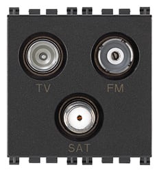 Presa coassiale TV-Radio FM-SAT, 5-2400 MHz, diretta (derivata) demiscelata, 3 uscite con connettore maschio (TV) e femmina (Radio FM) e tipo F (SAT), attenuazione di derivazione 1 dB, grigio - 2 moduli. Permette il passaggio di corrente continua e segnali di controllo (24 V 500 mA max)
