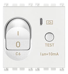 Interruttore automatico magnetotermico differenziale 1P+N C 6, alimentazione 120-230 V~ 50-60 Hz I∆n 10 mA, p.i. 1500 A - 2 moduli. Bianco.