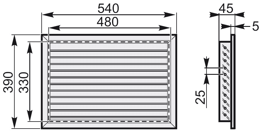 Griglia di ripresa/mandata aria esterna con alette orizzontali fisse, da applicare al plenum 500×350.