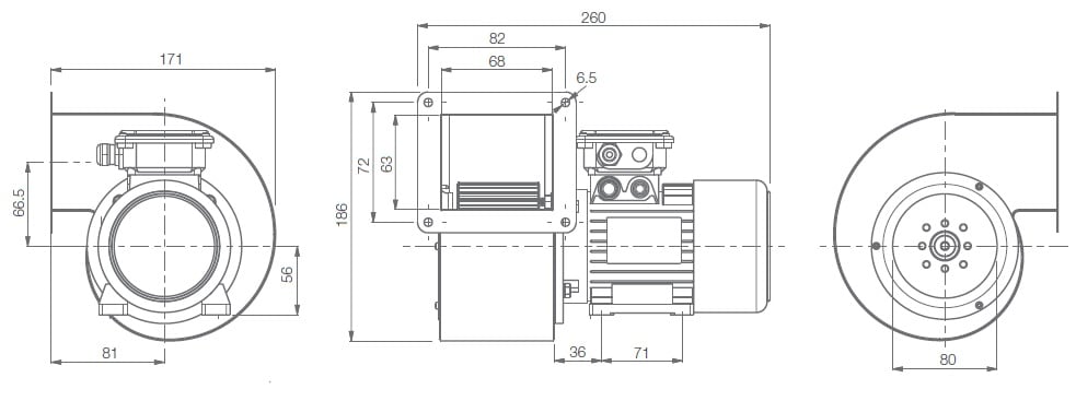 •Motore asincrono ad induzione,con grado di protezione IP54,autoventilato, montato su cuscinetti a sfera.•Girante in acciaio zincato protetta contro le ossidazioni con pale curvate in avanti per un altorendimento; facile estrazione della ventola per manutenzione e pulizia anche ad apparecchio installato. •Con dispositivo termico di interruzione a chiusura automatica incorporato nel motore. Non necessita di un collegamento ad un interruttore magnetotermico. •Telaio con coclea in lamiera d’acciaio verniciato con resine epossidiche, munita di foratura per consentire di orientare il motore in 8 posizioni diverse rispetto alla bocca di mandata. •Temperatura di funzionamento da –25°C a +40°C.