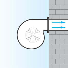 •Motore asincrono ad induzione,con grado di protezione IP54,autoventilato, montato su cuscinetti a sfera.•Girante in acciaio zincato protetta contro le ossidazioni con pale curvate in avanti per un altorendimento; facile estrazione della ventola per manutenzione e pulizia anche ad apparecchio installato. •Con dispositivo termico di interruzione a chiusura automatica incorporato nel motore. Non necessita di un collegamento ad un interruttore magnetotermico. •Telaio con coclea in lamiera d’acciaio verniciato con resine epossidiche, munita di foratura per consentire di orientare il motore in 8 posizioni diverse rispetto alla bocca di mandata. •Temperatura di funzionamento da –25°C a +40°C.