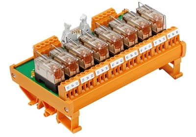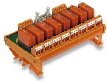 Gruppo di relè a innesto e spina a innesto. Il circuito della corrente di comando e il circuito della corrente di carico sono isolati elettricamente.