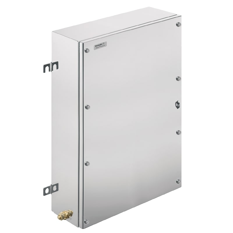 Custodia in metallo adatta all'uso in zone a rischio di esplosione. I fori per il montaggio sono posti all'esterno dell'area di tenuta stagna. Il montaggio a muro può essere realizzato utilizzando fori di montaggio o piedini di montaggio.