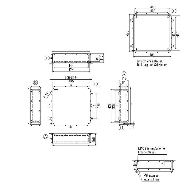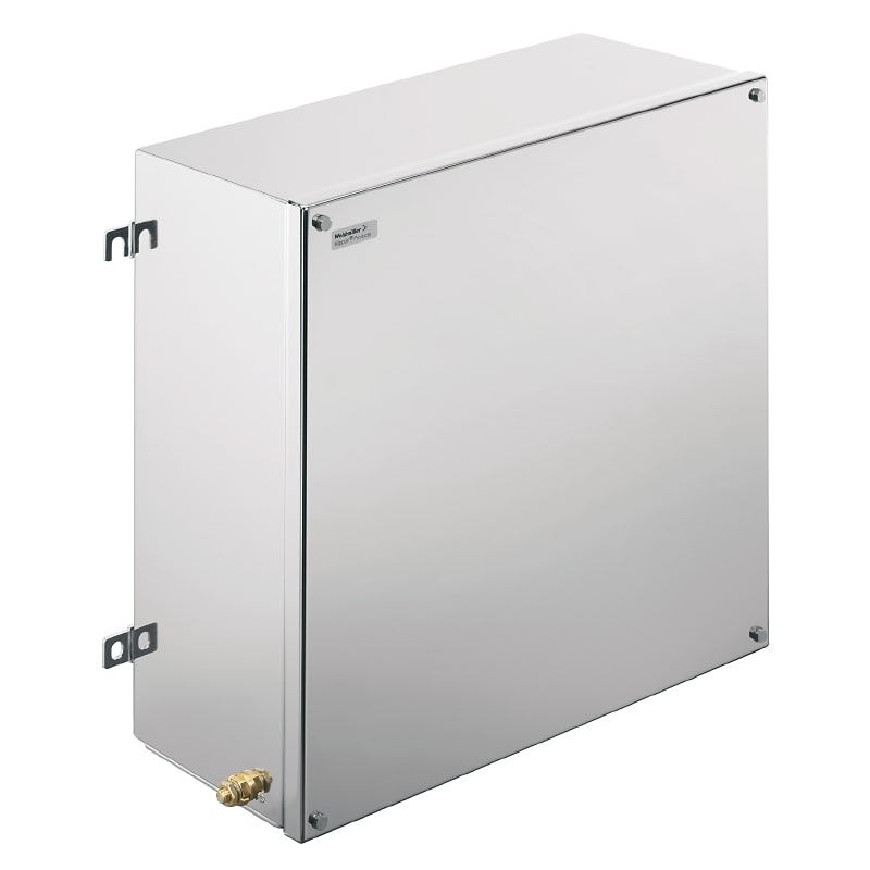 Custodia in metallo adatta all'uso in zone a rischio di esplosione. I fori per il montaggio sono posti all'esterno dell'area di tenuta stagna. Il montaggio a muro può essere realizzato utilizzando fori di montaggio o piedini di montaggio.