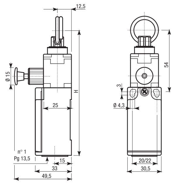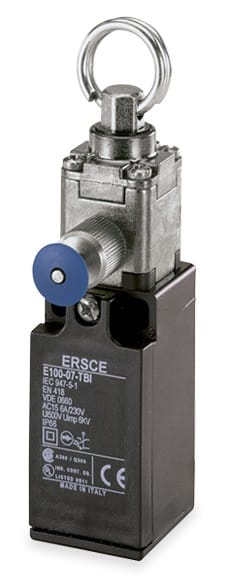 Interruttore di sicurezza a fune con reset, testina in metallo e corpo in plastica. Gli interruttori di sicurezza a fune sono indispensabili in tutte le applicazioni in cui l'operatore ha l'esigenza di poter comandare in qualunque momento e in qualunque punto della macchina l'arresto d'emergenza. Sono utilizzati principalmente per macchinari di notevole estensione, in cui non sono presenti in ogni punto del percorso produttivo ausiliari per il bloccaggio istantaneo del macchinario.