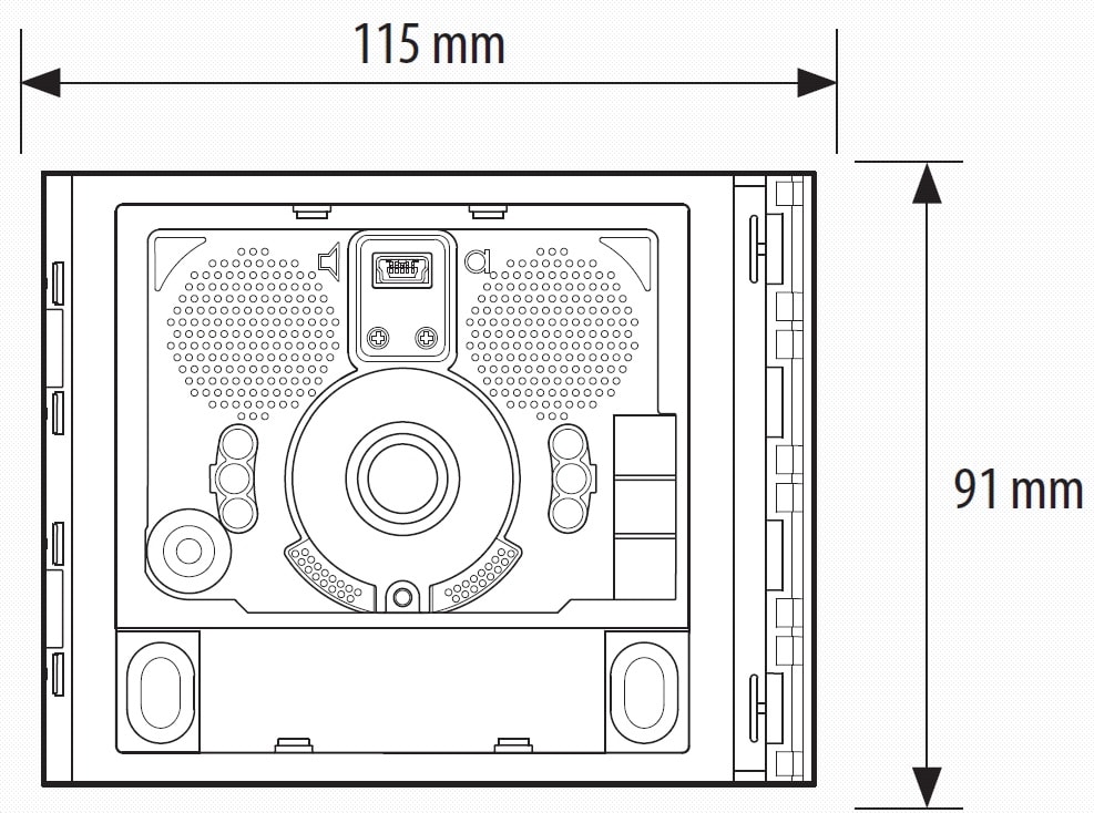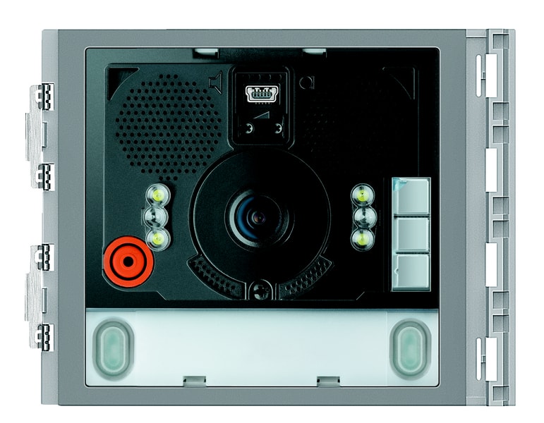 Modulo audio video grandangolare per la realizzazione di impianti videocitofonici a colori 2 fili. Dotato di telecamera a colori con sensore da 1/3“ e LED bianchi per illuminazione del campo di ripresa. Resistenza di preriscaldo antiappannamento. Regolazioni volume altoparlante e microfono. Gestisce fino ad un massimo di 98 chiamate a pulsanti utilizzando moduli pulsanti su doppia fila aggiuntivi. Consente l’apertura di una elettroserratura collegata direttamente ai morsetti S+ ed S- (18 V 4 A impulsivi - 250 mA mantenimento su 30 Ohm max) ed il collegamento di un pulsante apriporta locale sui morsetti PL. Predisposto per alimentazione supplementare. Dotato di LED frontali per la segnalazione dello stato di funzionamento: apriporta, comunicazione attiva,chiamata inoltrata e sistema occupato. Sensore ottico integrato per l’accensione della retroilluminazione notturna. Da completare con frontale di finitura. Il dispositivo deve essere configurato fisicamente oppure tramite PC e software TiSferaDesign.