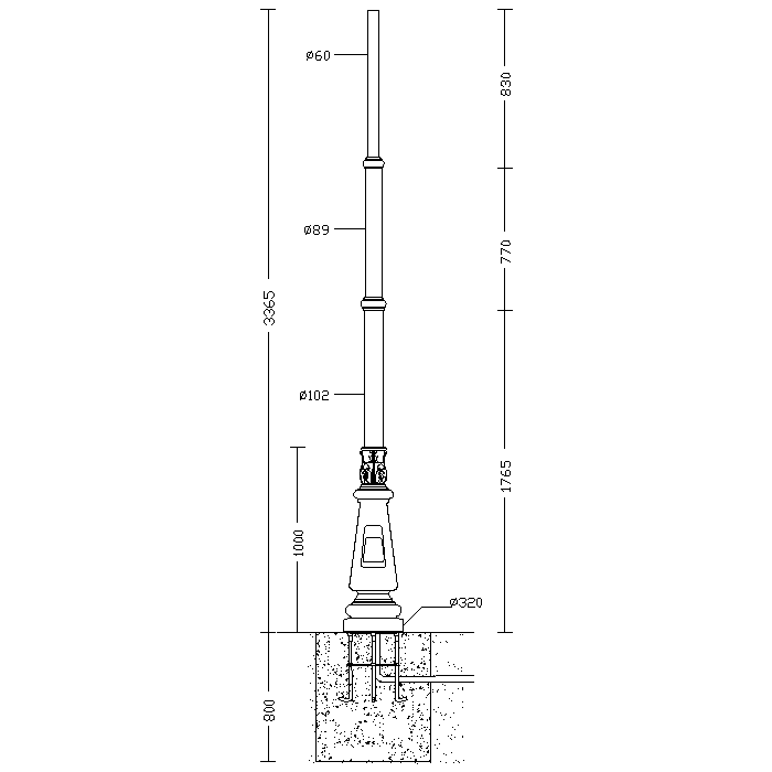 Palo in acciaio zincato a caldo e verniciato in polvere di poliestirene termoindurente. Base, finestra di ispezione e decori stampati in alluminio pressofuso e successivamente verniciati. Con finestra di ispezione, completa di 2 portafusibili di protezione, 2 fusibili da 16A, morsiettiera asportabile. Viteria in acciaio inox.