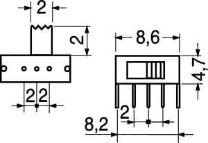 DEVIATORE MINIATURA 1 SCAMBIO 2 POSIZIONI. TERMINALI:c.s. PORTATA:0,3 A - 30 VCC. RESISTENZA CONTATTI:30 mOHM a 1A. VITA OPERATIVA:10.000 scatti.