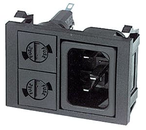 SPINA TRIPOLARE C14 CON DOPPIO PORTAFUSIBILE. FISSAGGIO:autobloccante. PORTATA:10 A - 250 V. CORPO:bachelite. CONTATTI:ottone nichelato. FISSAGGIO CAVO:faston 6,35. PER PRESE:13/845. CAVI:6/300.