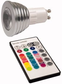 Lampada a led da 3W RGB dimmerabile 220Vca 30Lm GU10 grazie al telecomando IR che permette di selezionare il colore desiderato. Ideale per impieghi nei bar, discoteche, giardini, vetrine, ecc. Consumi minimi e lunga durata. Fornita con telecomando.