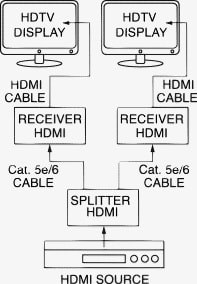 DISTRIBUTORE DI SEGNALE 1x2 SPLITTER HDMI CON ESTENSORE SCHERMATO 50mt SU SINGOLO CAVO CAT5e/6. Questo splitter HDMI permette di sdoppiare il segnale audio video e permette di estenderlo sino a 50mt mediante cavo CAT5e/6 (per la lunghezza massima è sempre consigliato un cavo CAT6 di qualità, schermato e con conduttori in rame). Composto da un trasmettitori e 2 ricevitori.Cavi HDMI e cavo CAT5e/6 non forniti.