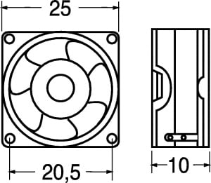 VENTILATORE ASSIALE SUPPORTO CUSCINETTI 25x25x10 mm. ELICA:poliestere termopl. TEMP. LAV.:-20°C÷+80°C. FATT. RUMORE:30,2 dB. GIRI MIN./RPM:10.000. CFM:1,95. Per computer, strumenti, ali-mentatori, amplificatori, tele-visori, videogiochi, videoregi-stratori, ricetrasmittenti.