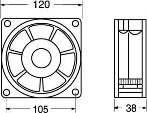 VENTILATORE ASSIALE SUPPORTO BRONZINE 120x120x38 mm. ELICA:poliestere termopl. TEMP. LAV.:-10°C÷+70°C. FATT. RUMORE:42 dB. GIRI MIN./RPM:3000. CFM:105. GRIGLIA:45/9655. Tensione: 110V.