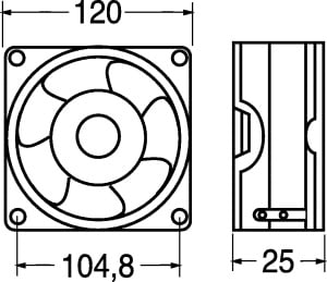 VENTILATORE ASSIALE SUPPORTO CUSCINETTI 120x120x25.4 mm. ELICA:poliestere termopl. TEMP. LAV.:-20°C÷+80°C. FATT. RUMORE:42 dB. GIRI MIN./RPM:3000. CFM:80. GRIGLIA:45/9655. Per applicazioni varie. Tensione: 24V.