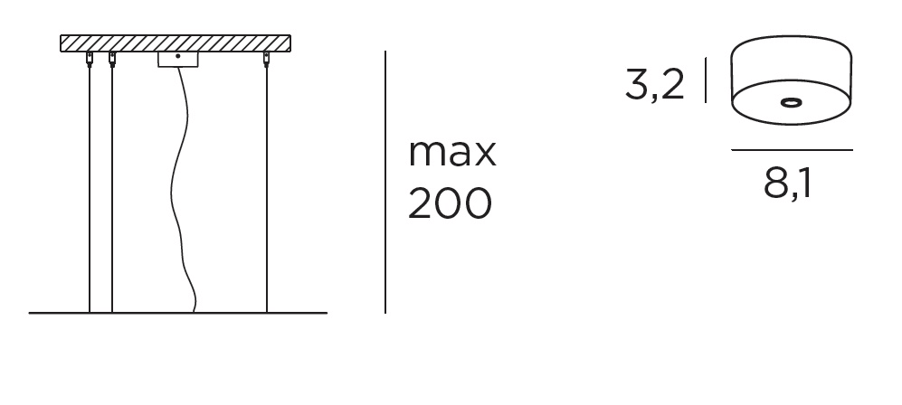 Kit sospensione IO/QUATTRO con rosone in policarbonato bianco lucido, cavo elettrico 3x0,75mm² e cavi di sospensione in acciaio completi di regolazione micrometrica “Griplock”. Kit per montaggio a sospensione “biemissione”. Per versione: ø65cm.