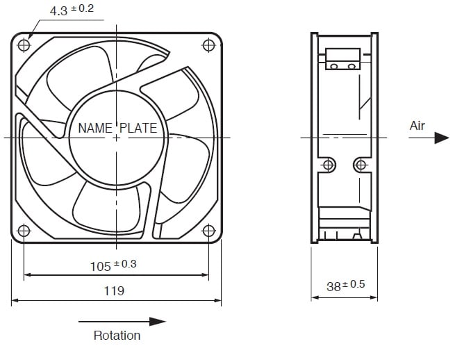 Ventilatore assiale compatto per il raffreddamento di motori in AC a poli schermati, provvisto di cuscinetti a sfera di grande durata. Connessione tramite terminali serie 110 (2,8x0,5 mm). Con dispositivo termico di protezione.