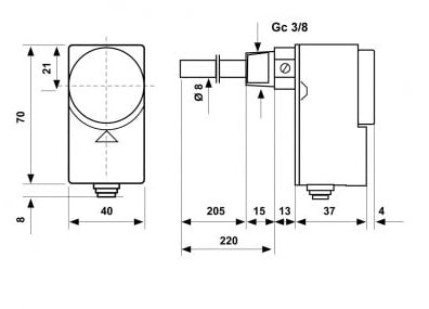 Termostati di regolazione per impianti di riscaldamento, bagni, forni di essicazione, ecc.Microinterruttore in commutazione e microinterruttore con riarmo manuale.Scatto rapido, contatti in AgCdO dorati.Tensione nominale d'isolamento Ui 380V~.Corrente nominale di servizio continuativo Ith 15A. Rispondenza alle norme CEI EN 60947-5-1. Montaggio a immersione mediante guaina filettata Gc3/8 (compresa nella confezione ).All'aumento della temperatura apre 1-2 chiude 1-4.Funzionamento a bimetallo. Elemento sensibile a bimetallo INVAR OTTONE.Guaina guaina di protezione in ottone con attacco Gc 3/8- PN10.Basetta, coperchio e manopola in materiale termoplastico antiurto e autoestinguente V0.Uscita dei collegamenti elettrici con passacavo in PVC.Temperatura di immagazzinaggio e trasporto -35÷120 °C .Peso unitario 0,26 Kg.