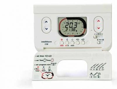 Cronotermostato elettronico a microprocessore, con programmazione giornaliera per il comando di impianti di riscaldamento e di condizionamento.Alimentazione con 2 batterie stilo AA da 1,5V lunga durata.Modulo trasmettitore RF con potenza minore o uguale a 25mW, ad 868,350 MH z.Intellitherm C58RF viene fornito con uno zoccolo adatto per il montaggio su scatole da incasso a 3 moduli, tonde o per montaggio a parete, la sporgenza dell'apparecchio è minima e l'ambientazione ancora più facilitata.Montare il cronotermostato a 1,5 metri di altezza dal pavimento, lontano da cucine, finestre, porte e fonti di calore in generale.Due pulsanti colorati, uno rosso e l'altro blu per la regolazione delle temperature di COMFORT e di ECONOMY.Un cursore per la scelta del modo di funzionamento: A1, A2, COMFORT, ECONOMY, ANTIGELO.Un cursore per la scelta del tipo di funzionamento: ESTATE-INVERNO, con lo stesso cursore si può accedere alla programmazione.Due tasti per la regolazione dell'ora in corso.Tre tasti per la scelta del periodo di COMFORT, di ECONOMY e ANTIGELO.Un tasto di RESET per ripristinare il programma preimpostato.Un dip switch per selezionare il modo ANTIGELO 5°C oppure SPENTO (ON a 0°C).Possibilità di visualizzazione dei dati statistici dell'impianto: ore di funzionamento del giorno precedente e dall'inizio del funzionamento dell'apparecchio, temperatura minima e massima del giorno precedente e l'ora in cui viene misurata.Possibilità di sapere per quante ore è stato "richiesto calore" (relè chiuso - ON) il giorno precedente e dall'inserimento delle pile o da un reset