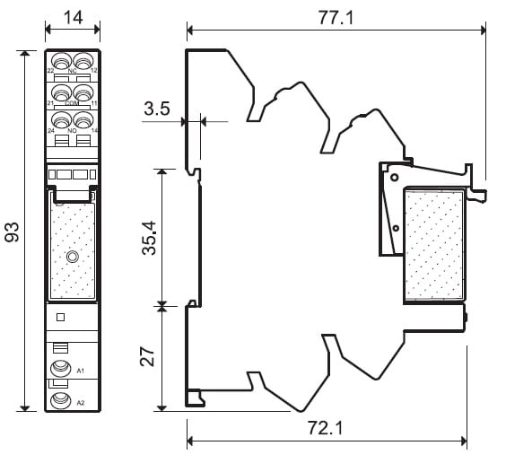 Interfaccia modulare a relè. (A): 8 N°contatti: 2 CO Materiale contatti: AgNi Collegamento elettrico: raccordo a molla Alimentazione: AC Volt AC: da 230 a 240 V. non polarizzato monostabile Grado di protezione: IP20 Accessori: Pettine 8 poli;separatore plastico.