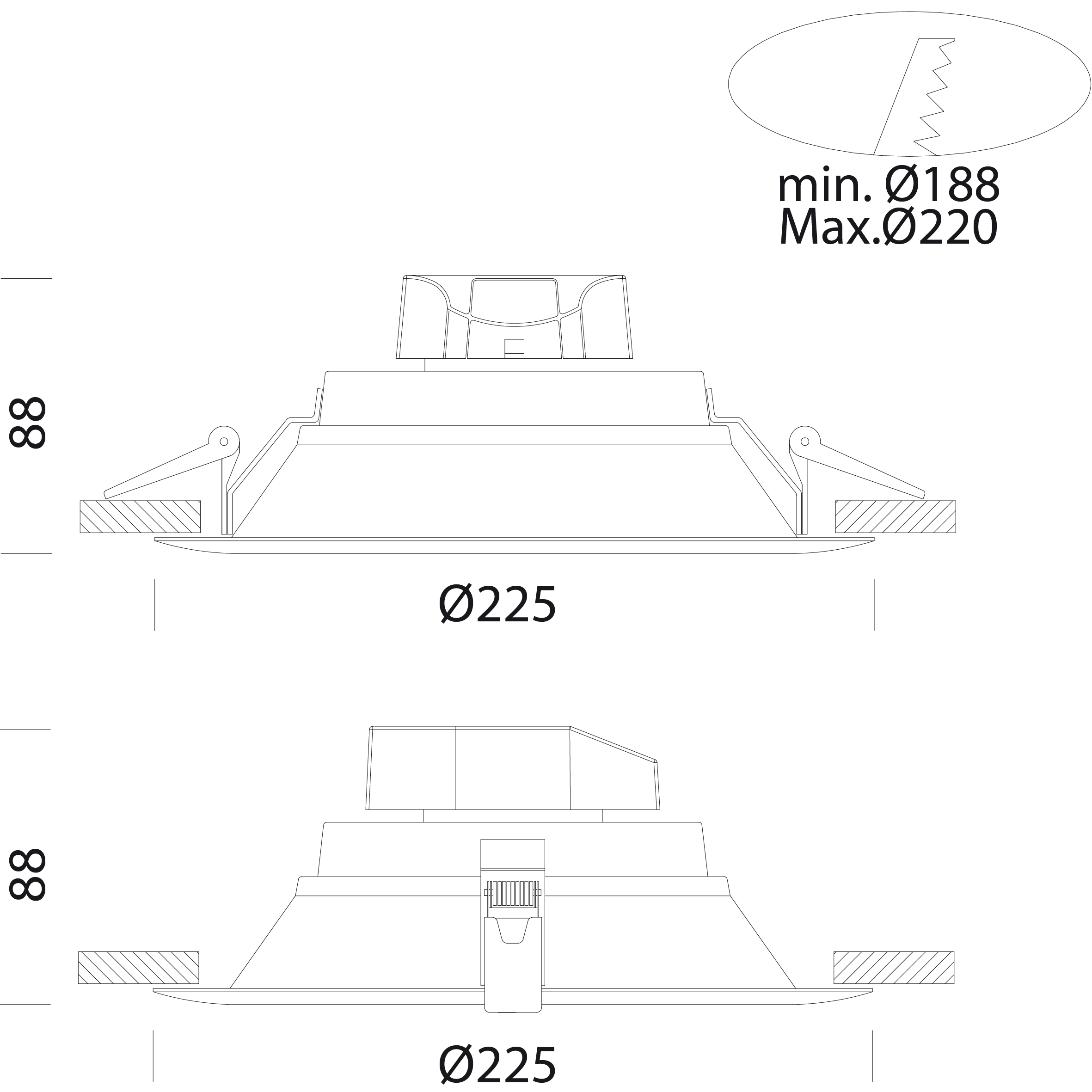 Speaker 3 BASIC. Corpo/Riflettore: in alluminio verniciato bianco. LED: 21W 3000K - 2000lm - CRI 80. Mantenimento del flusso luminoso al 70%: 25.000h (L70B50). Fattore di potenza: >0,9.