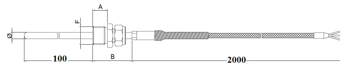 termoresist. ossido minerale: Mod.: TR1M (singolo elemento) modello: con raccordo a compresione scorrevole elemento + numero fili:Singolo 3 fili classe precisione:Pt100 classe B (1 DIN) Cavo (Standard a norma DIN):GSC (0,35 mm) Materiale guaina: AISI 316Diametro guaina (mm): 3 filettatura raccordo:G 1\4 ''A'' = 12mm Materiale raccordo: ottone nichelato lunghezza cavo (dm):20 dm tipo di connettore:nessun connettore armatura:nessuna guaina lunghezza immersione Li (mm): 100 mm certificati: nessuno