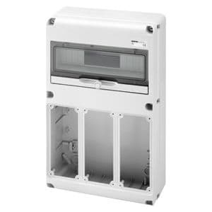 Quadro stagno Q-DIN 14 moduli vuoto in plastica grigio RAL 7035 IP65. • Numero di IEC 309/IB alloggiabili: 3 IB Verticali 16/32 A IP 67 • Numero di coperchi ciechi in dotazione: 1 IB 16/32A