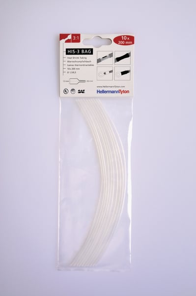Guaina a parete sottile e flessibile in poliolefina reticolata. Elevato rapporto di restringimento (3:1). Pratici sacchetti di dimensioni ridotte con 10 spezzoni pretagliati di lunghezza 200 mm. Si adatta a cavi con diametro variabile. Le guaine HIS-3 insacchetto sono utilizzabili per l'isolamento e la protezione di cavi e cablaggi.
