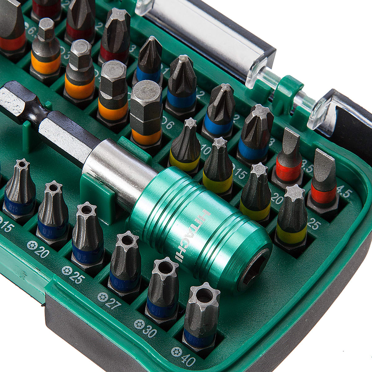Confezione inserti e bussole assortite, composta da 32 articoli: • 1 portainserti • 4 inserti a croce Phillips (PH 1 - 2xPH 2 - PH 3) • 4 inserti a croce Pozidriv (PZ 1 - 2xPZ 2 - PZ 3) • 4 inserti esagonali (3 - 4 - 5 - 6) • 7 inserti torx (T10 - T 15 -T 20 - T25 - T27 - T30 - T40) • 7 inserti torx di sicurezza (T10 - T 15 - T 20 - T25 - T27 - T30 - T40) • 4 inserti a taglio (3,5 - 4,5 - 5,5 - 6,5) • 1 adattatore da attacco esagonale 1/4'' a quadro 1/4''